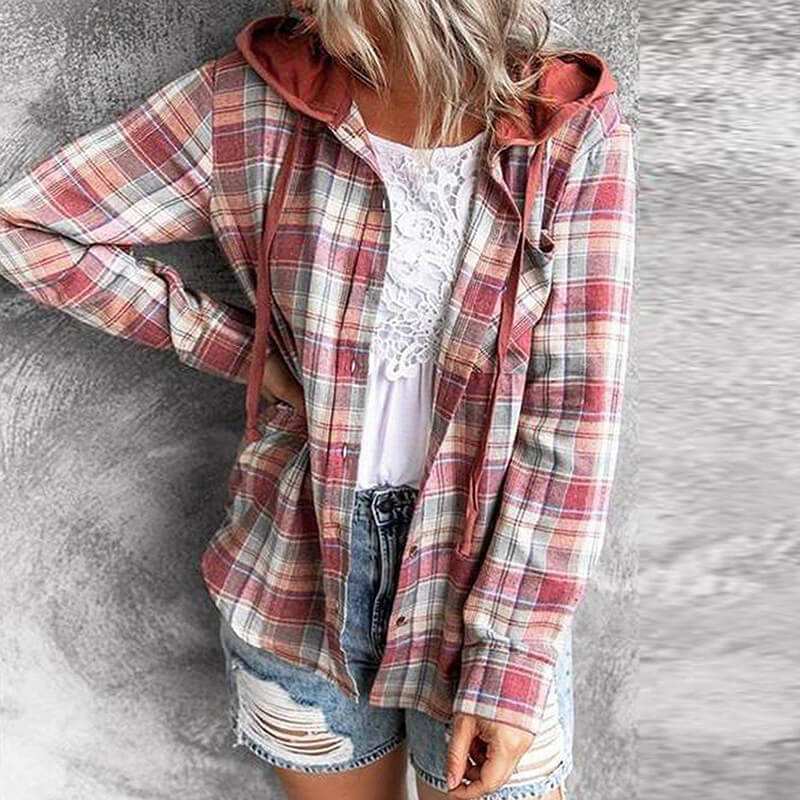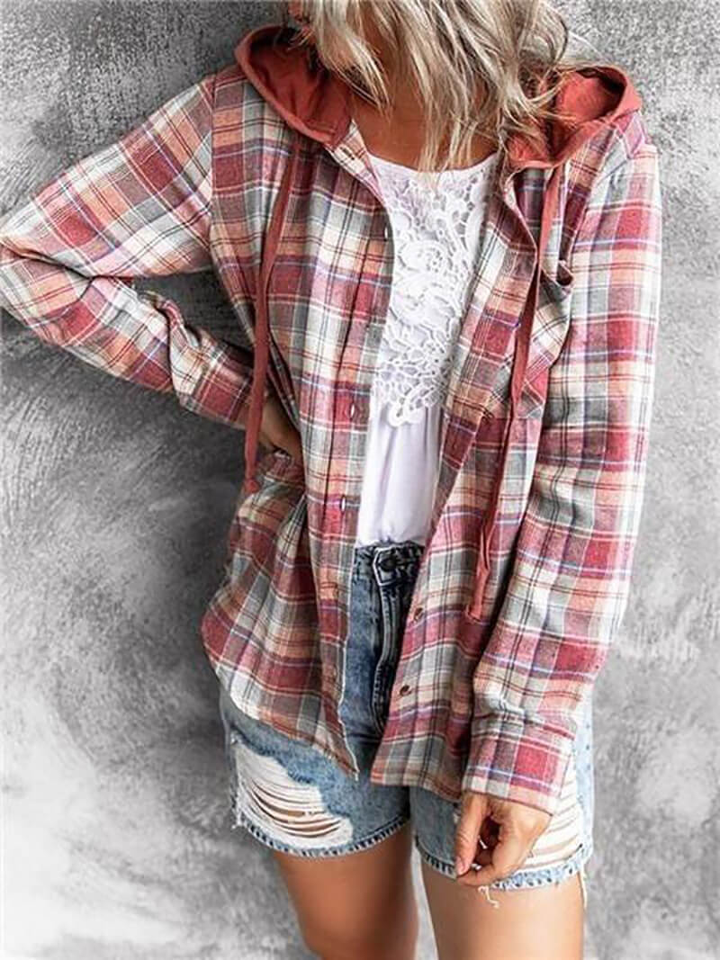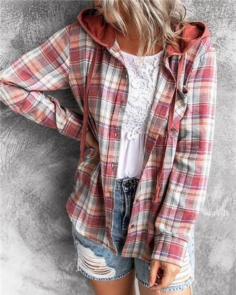 This retro 90s inspired button-up checkered hoodie is just what you need to keep you cozy and warm in easy style. This relaxed hoodie features an all-over checkered pattern, buttons on the front, and a drawstring hood, making it versatile and easy to wear with denim, sweatpants, a skirt, or anything you please.