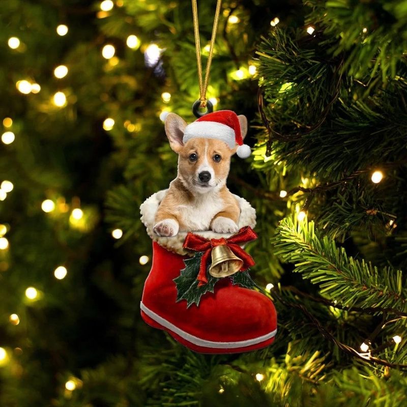 Pembroke Welsh Corgi Fawn & White In Santa Boot Christmas Hanging Ornament SB178